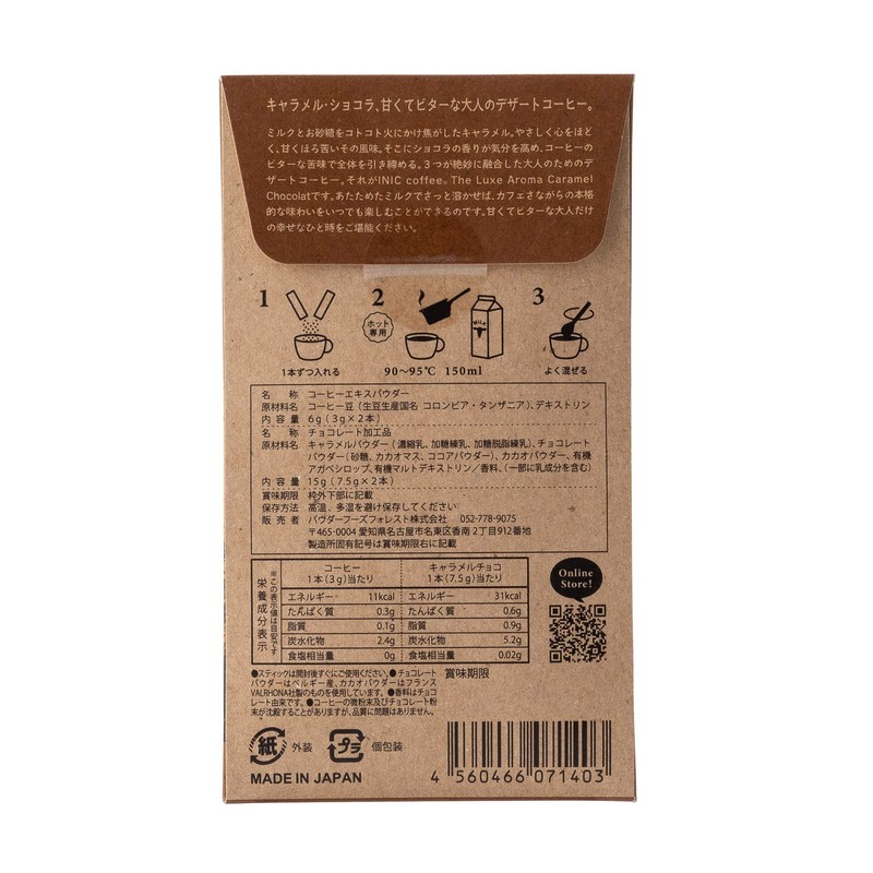 - 3 exquisite fused sweet coffee for adults. This is the Inic Coffee (R) Luxe Aroma Caramel Chocolate