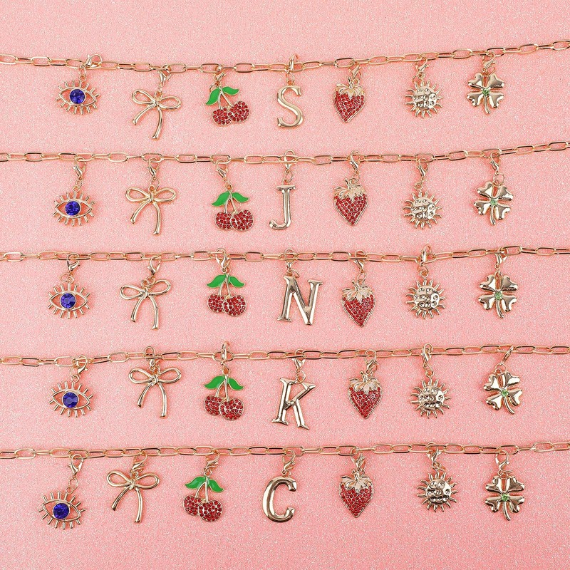 - Symbolic Charms: Each charm in this Initial charm necklace carries its own unique significance. The Evil Eye pendant is a powerful symbol believed to offer protection against negativity and bad luck, providing the wearer with a sense of security and insight. The Four-Leaf Clover, a rare and cherished find, represents luck and hope, with each leaf signifying faith, hope, love, and luck. The Sun charm radiates warmth and vitality, symbolizing positive energy and brightness in life. Additionally, the Bow pendant embodies good wishes, sweetness, and love, while the Cherry and Strawberry pendants evoke feelings of youthfulness, vitality, and romance, symbolizing sweetness and abundance in life.