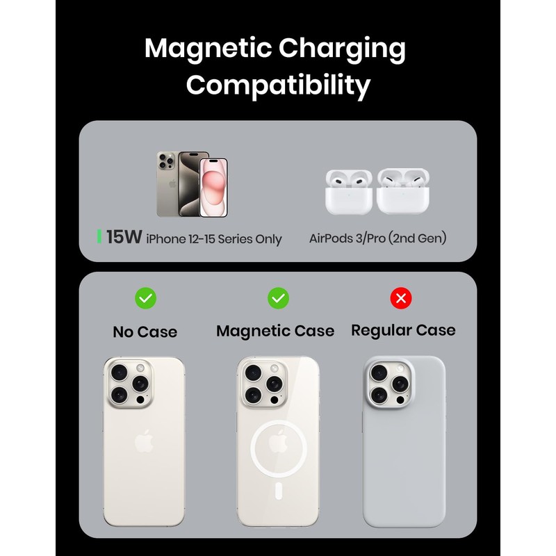 - Solo para iPhone serie 12-15】Nuestro cargador ofrece carga inalámbrica magnética sin costuras para todos los modelos de la serie 12-15, incluso con fundas de teléfono (solo fundas magnéticas