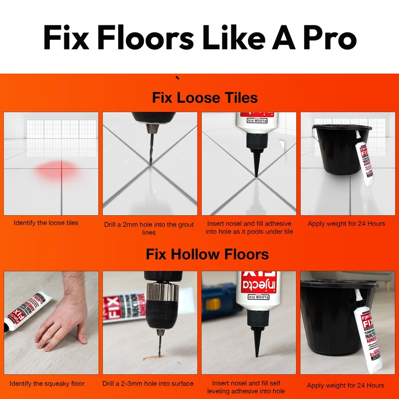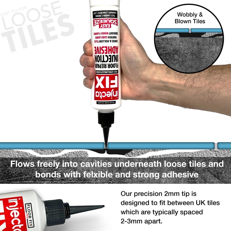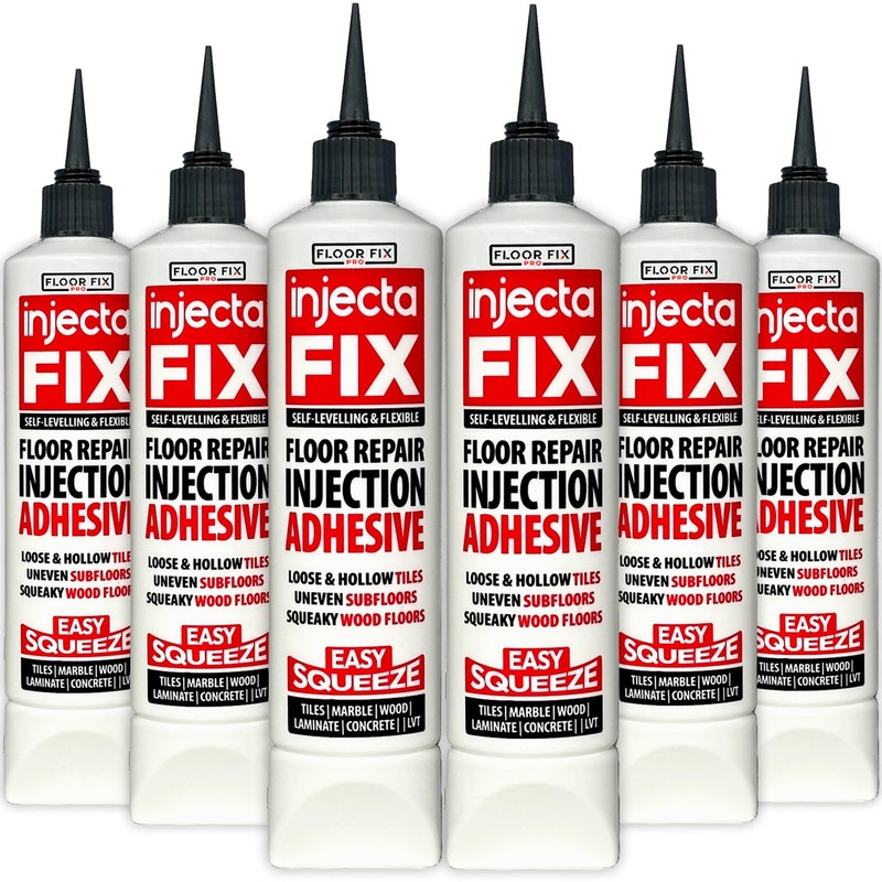 - Make floor repair simple with the Original Injectfix Easy Squeeze the all-in-one Loose Tile And Hollow Floor Repair system is designed to fix loose and hollow tiles, wood, laminate, and LVT and ideal for tackling squeaky wooden floors with just a squeeze.