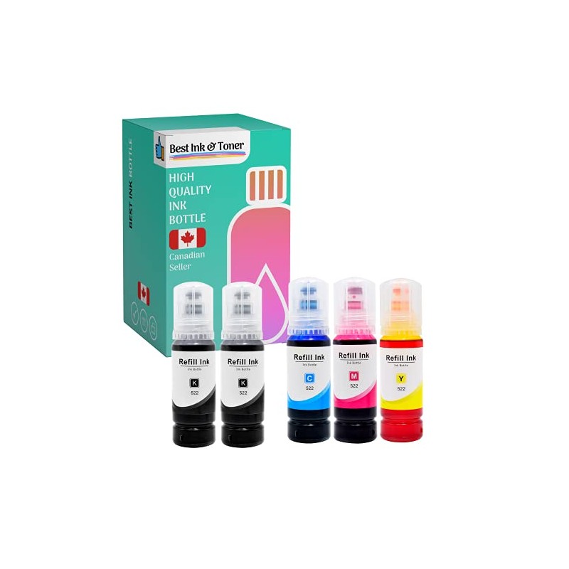 Ink House Compatible Ink Bottle 5 Pack Replacements for 522 T522 (2 Black, 1 Cyan, 1 Magenta, 1 Yellow, 5-Pack) for use inET-2720, ET-2800, ET-2803, ET-4700, ET-4800