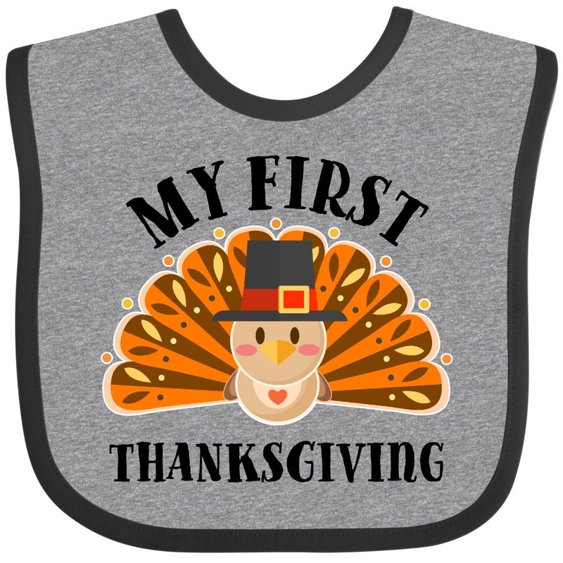 inktastic My First Thanksgiving Cute Turkey Pilgrim Hat Baby Bib Heather and Black 32d96