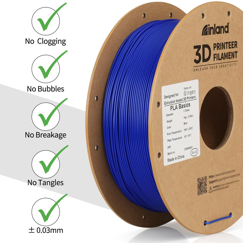 - PLA Basics 3D Printer Filament – Affordable Quality You Can Trust Inland PLA Basics is crafted for reliability and ease of use, making it perfect for rapid prototyping, everyday prints, and beginner projects. Designed for low-warp, odorless printing with a glossy surface finish—at a value price without sacrificing Micro Center quality.