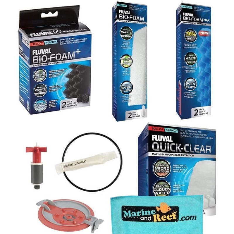 - This Bundle has FOUR items that combined have EIGHT products for your Fluval 407 Aquarium Filter: Fluval 407 Filter Quick-Clear Water Polishing Pad, 6-Pack (A244); Fluval 407 Filter Bio-Foam, 2-Pack (A226); Fluval 407 Filter Bio-Foam+ (A237); Fluval 407 Filter Bio-Foam Max, 2-Pack (A189); Fluval 407 Impeller Cover (A20148); Fluval 407 Magnetic Impeller (A20169); Fluval Motor Head Seal Ring (Gasket) Filters (A20064); Inland Seas Super Lube Silicone Grease; & a Towel.