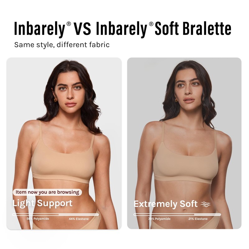 - Note the difference: Inbarely colletion bralette - light support and smooth(Now you are browsing). Inbarely soft colletion bralette-extremely soft and comfortable(Find in our Product Description)