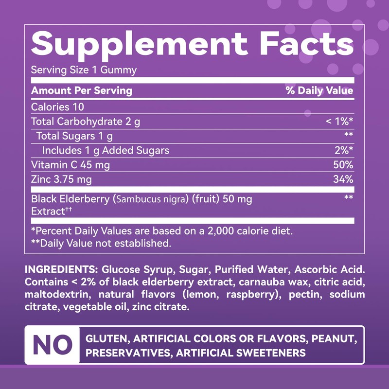 • Standardized Elderberry Extract – Each gummy contains 50mg of Sambucus nigra extract (34:1), equal to 1.7g of fruit.