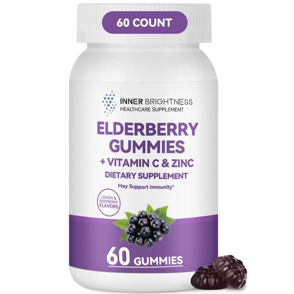 Inner Brightness Elderberry Gummies with Vitamin C & Zinc – Immune Support Supplement for Adults – Sambucus Black Elderberry 50mg per Gummy – Lemon & Raspberry Flavor – 60 Count – Non-GMO, Gluten Free