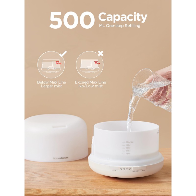 • Prolonged Aromatherapy and Humidification: With a capacious 500ml and easy-to-clean water tank, the InnoGear oil diffuser can run for up to 18 hours (9-12h for strong mist and 16-18h for weak) without the need for mid-session refills, to elevate your sensory experience from the moment you wake for the day to the last few minutes before you drift off to sleep at night.