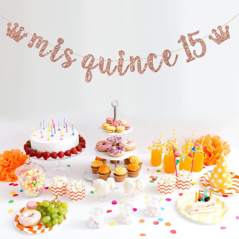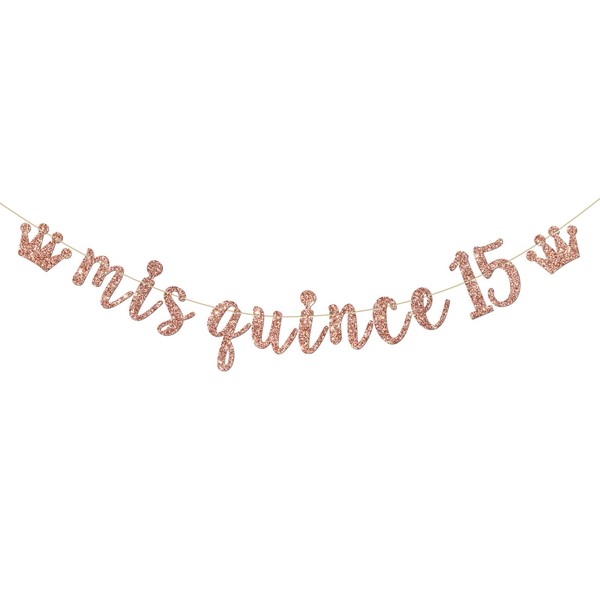 INNORU Mis Quince 15 Banner, Girls 15th Birthday Party Decorations, Fifteen Sign Banner, 15th Birthday Party Decorations, Rose Gold Glitter