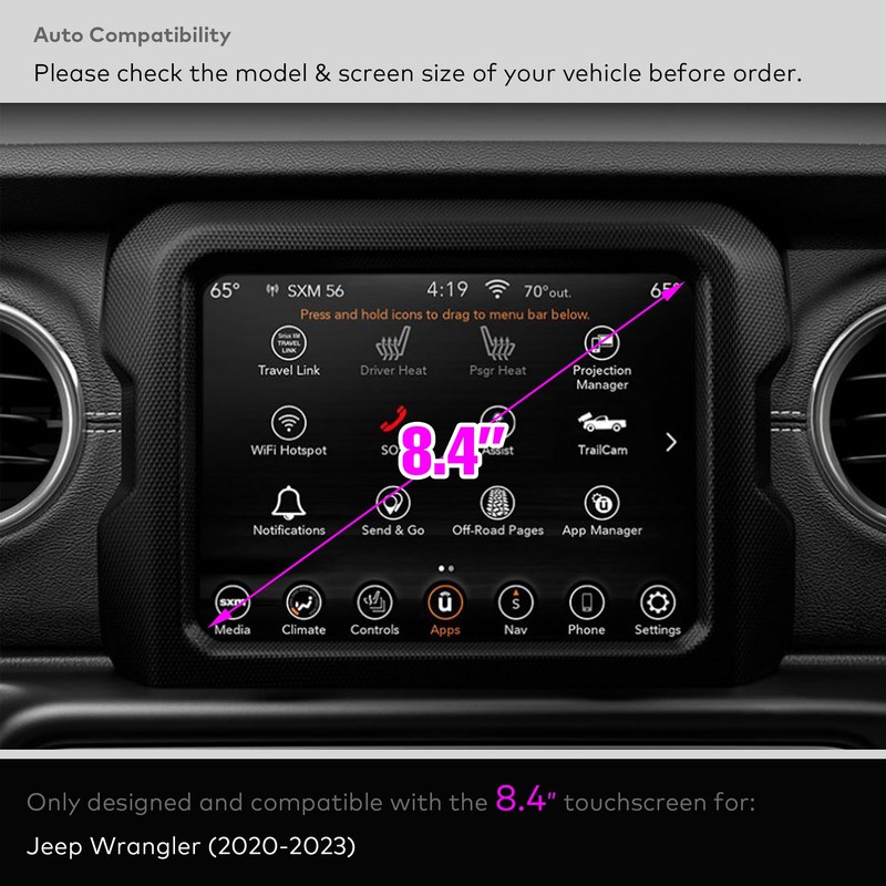 - Only designed for 2020 2021 2022 2023 Jeep Wrangler 8.4 Inch Infotainment Touchscreen, perfect size fitness.