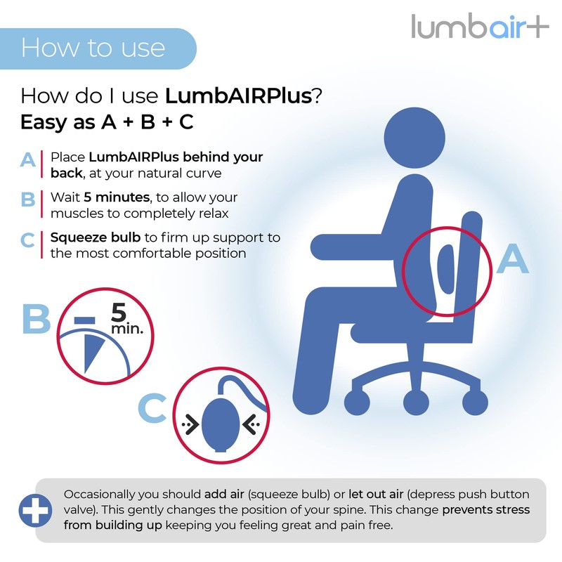 - Ideal for small offices, bucket seats, automobile contoured seats, smaller seats and airplanes, the LumbAIRplus portable backrest can be placed and inflated whenever instant back or neck comfort is needed.