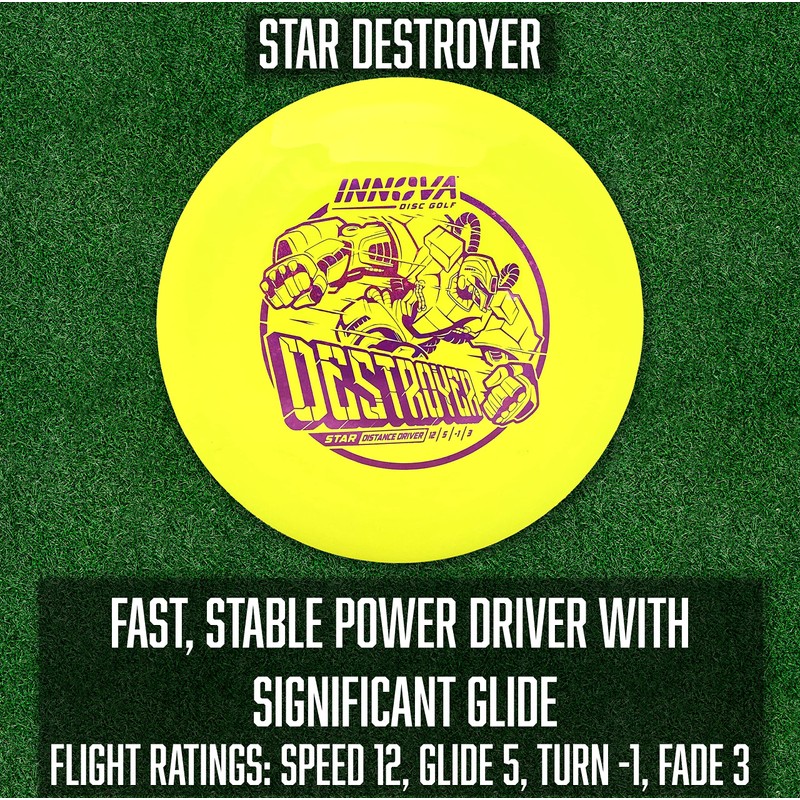 - STAR DESTROYER – The distance driver to rule them all. The Destroyer is a fast, stable power driver with significant glide. A great disc for sidearm throwers and those with lots of power. 170-175g. Colors Will Vary.