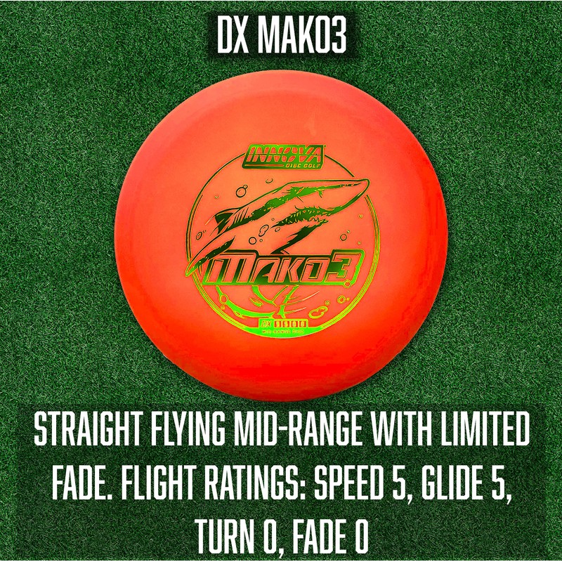 - DX MAKO3 – This Mid-Range disc is the perfect solution for anyone who wants a straight flyer with very limited fade. The easy to grip and release rim offers clean consistent releases. The Mako3 is a great disc for one disc rounds. 175g+. Colors Will Vary.