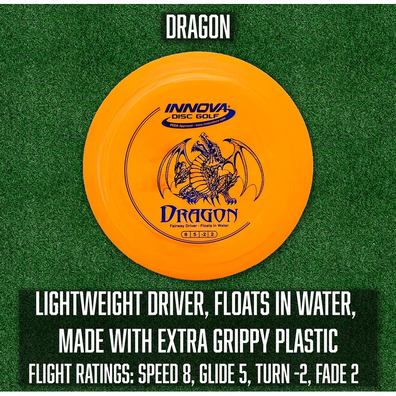 - DRAGON – The Dragon is a lightweight driver with excellent glide for less powerful throwers who want to get more distance with less effort. Made with a special blend of plastic, the Dragon has great grip and will float in water. 151-159g. Colors Will Vary.