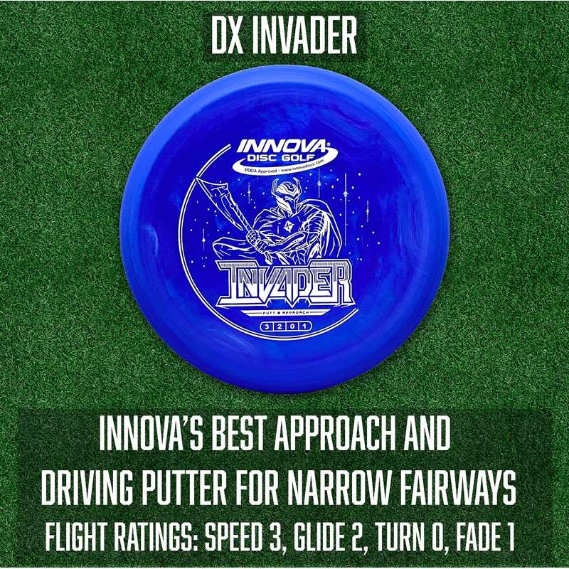 - DX INVADER – The Invader is Innova’s best approach and driving putter for narrow fairways. Its flat-top profile features a rounded, small bead rim making it easy to grip-n-rip straight flights. Put torque onto the Invader, it can handle it—backhand and forehand. 170-175g. Colors Will Vary.