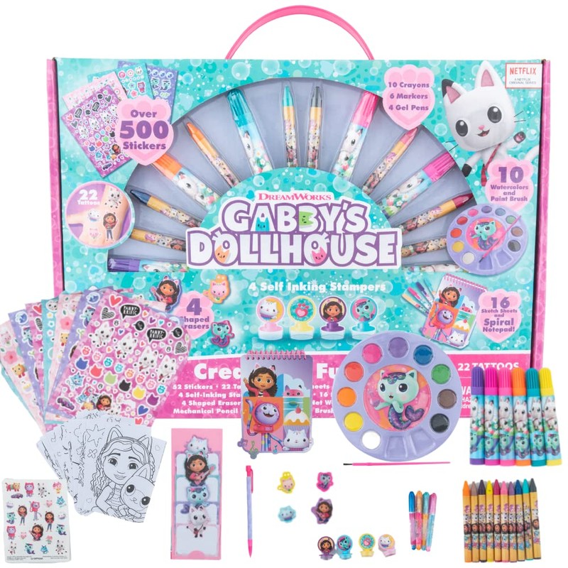 - GABBY ACTIVITY SET - The complete set includes 16 sticker sheets, 22 tattoos, 16 sketch sheets, 10 crayons, 6 markers, 4 self inking stamps, 4 gel pens, 16 stacking memo sheets, 4 shaped erasers, 10 watercolors, a mechanical pencil for drawing, a paint brush, and a spiral notepad (40 sheets).
