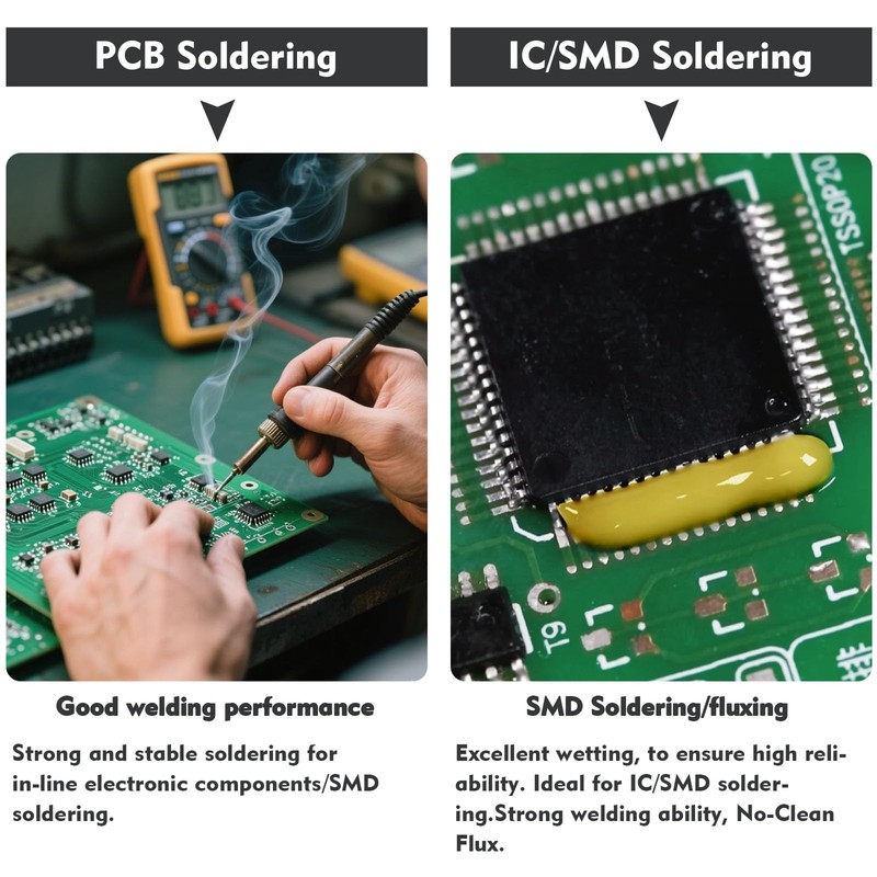 - No-Clean: The soldering flux for electronics is delicate and white, with very little residue, and can achieve no-clean performance. The convenient syringe dispenser is very suitable for the repair and repair of surface mount components