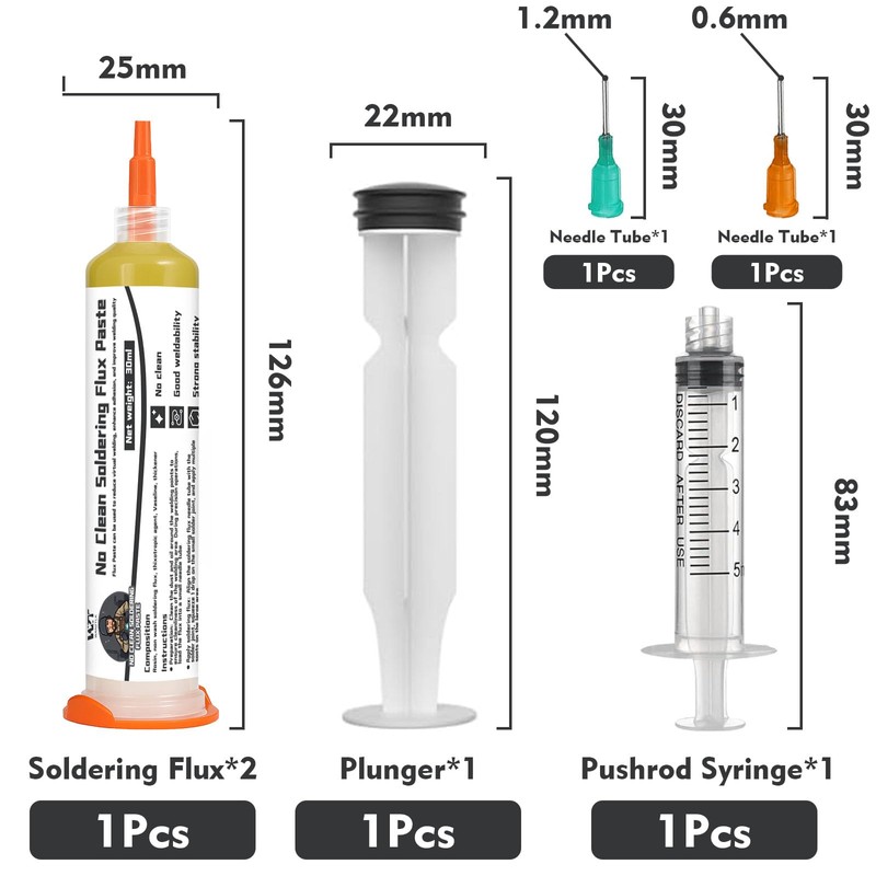 - Two sizes: The flux paste set has two sizes of syringes. Different sizes can be used for welding according to actual usage. The small syringe design is easy to use, squeezes out the appropriate capacity, and is convenient for storing solder paste flux
