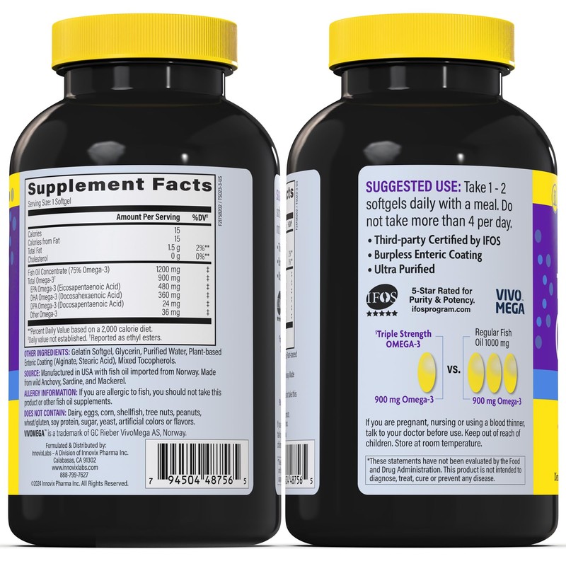 - IFOS Certified Fish Oil: Independently certified by a third party for your peace of mind, each batch is tested for purity, potency, and freshness. InnovixLabs’ Triple Strength Omega-3 Fish Oil is purified to reduce contaminants, cholesterol, and mercury.