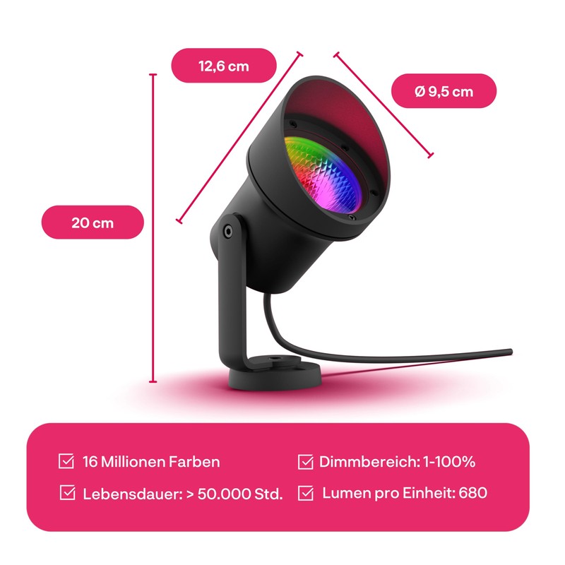 - Garden lighting at the highest level: add colourful light accents to your garden. Perfect for lighting trees, large shrubs and facades. Choose from all shades of white and 16 million different colours.
