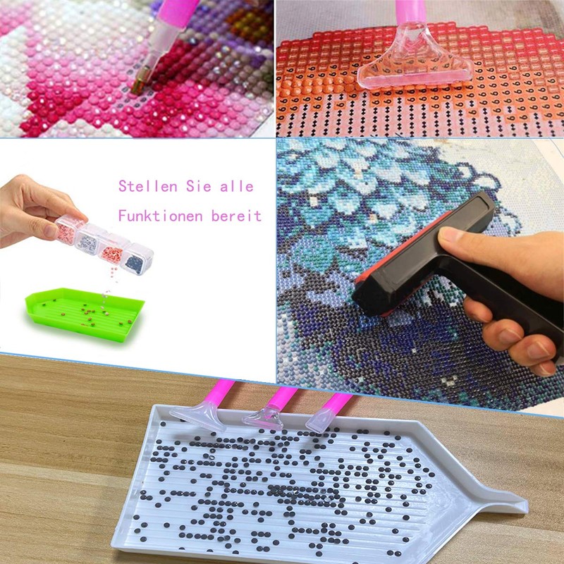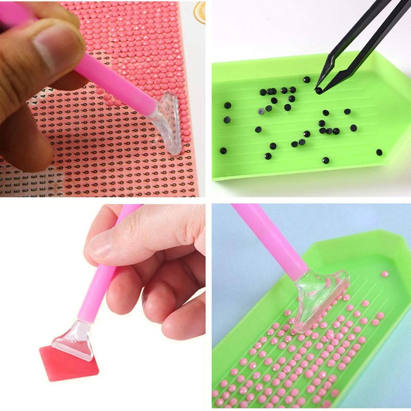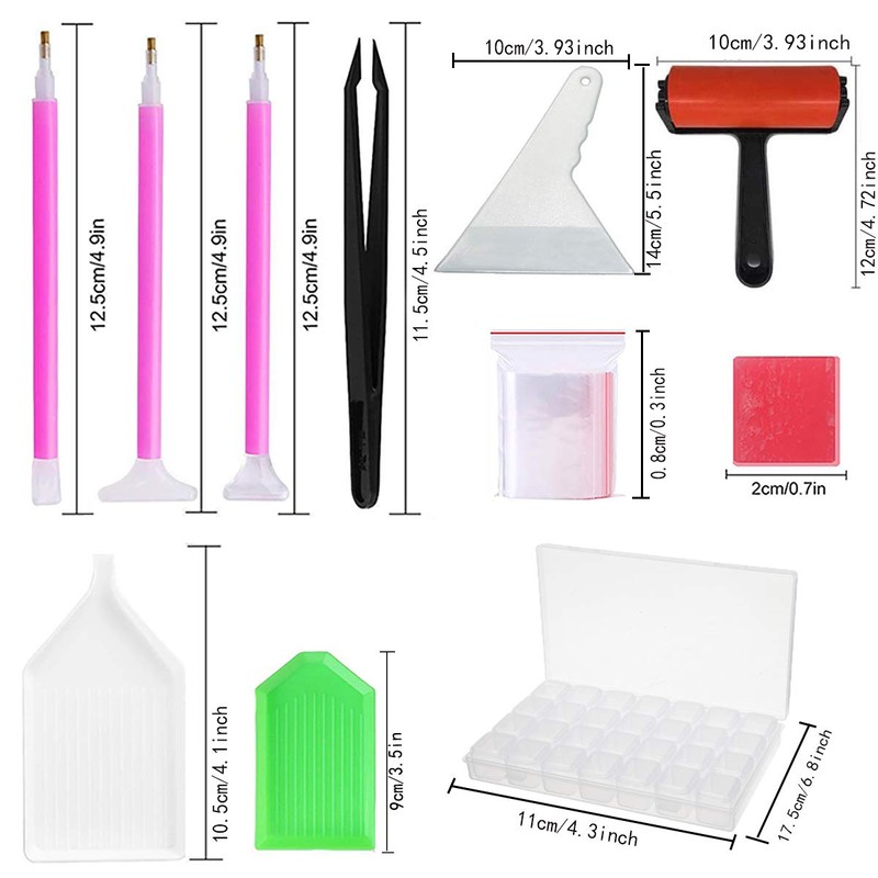 - Perfect for diamond painting: this 5D diamond painting accessory set contains 4 sticky diamond pens (3 different types), 4 non-slip pen sleeves, 3 plastic trays (2 different types), 1 pair of tweezers, 1 roller tool, 1 corrector tool, 4 50 bags, 10 adhesives, 1 sheet of labels (40 labels), and 1 storage box with 28 Compartments. Satisfy your daily needs with this set.