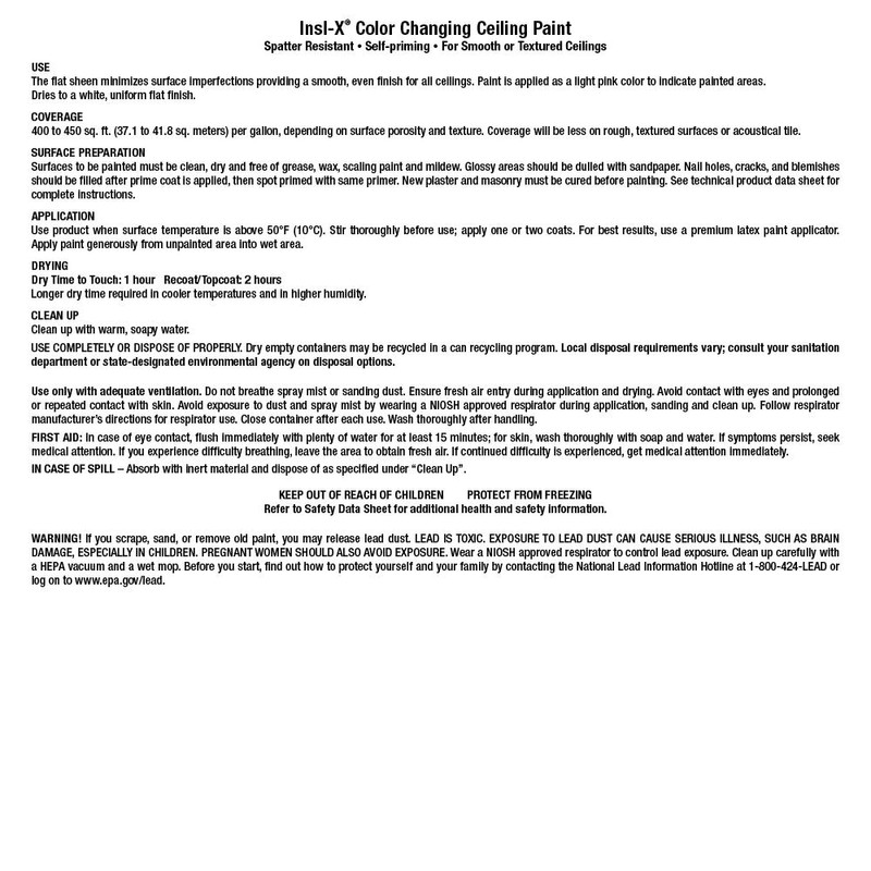 INSL-X Color-Changing Ceiling Paint makes painting ceilings easier. This product was developed with a special disappearing pink color-change technology so that when it is applied, it goes on pink to indicate painted areas and then dries white, helping to prevent any missed spots. The paint dries to a uniform flat white finish minimizing any surface imperfections. This ceiling paint is also easy to clean up with just soap and water.