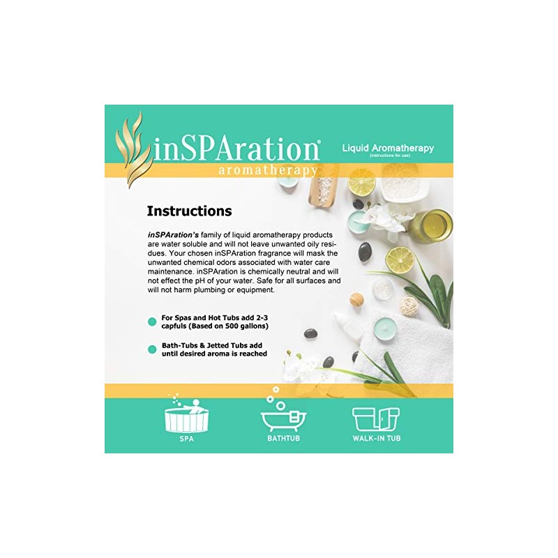 Insparation spa fragrance 9 oz. Bottles! directions: for spas & hot tubs add 2-3 capfuls. For baths add until desired aroma is reached. Insparation, the leading Aromatherapy fragrance, for spas, hot tubs & whirlpool baths has been manufacturing fragrances for over 30 years. Their unique Aromatherapy blends are formulated for your hot water enjoyment, creating a rich soothing "Aromatherapy experience." Inspirational large variety of fragrances & fragrance blends create that ultimate spa experience while at the same time leaving your skin Soft & moisturized. Insparation liquids & crystals are all rx enhanced. Natural aloe vera extracts & vitamins E & C have been added to the proprietary blend. Tested by DuPont, Aristech & other leading acrylic manufacturers, insparation is Proven to be safe for all spa, hot tub & whirlpool bath surfaces. Ideal for masking those unwanted chemical odors without foaming, affecting pH level, or water chemistry. Formulated specially for jetted systems whether for spas, hot tubs, or hydrotherapy tubs, insparation has been Proven safe for all motors, jets & acrylics. Insparation contains no alcohol & is water-soluble. Insparation's custom blended fragrances come packaged in 9oz. Bottles, 1/2oz.Single-use pillow packets, spa crystals, sampler bags & many different kinds of gift packages. With over 50 fabulous blends there are scents for every different occasion.