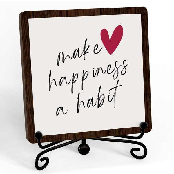 Inspirational Office Wooden Sign With Stand, Make Happiness A Habits Desktop Decoration, Positive Gifts For Women Men Friends Colleagues, Rustic Home Office Desk Decor -17