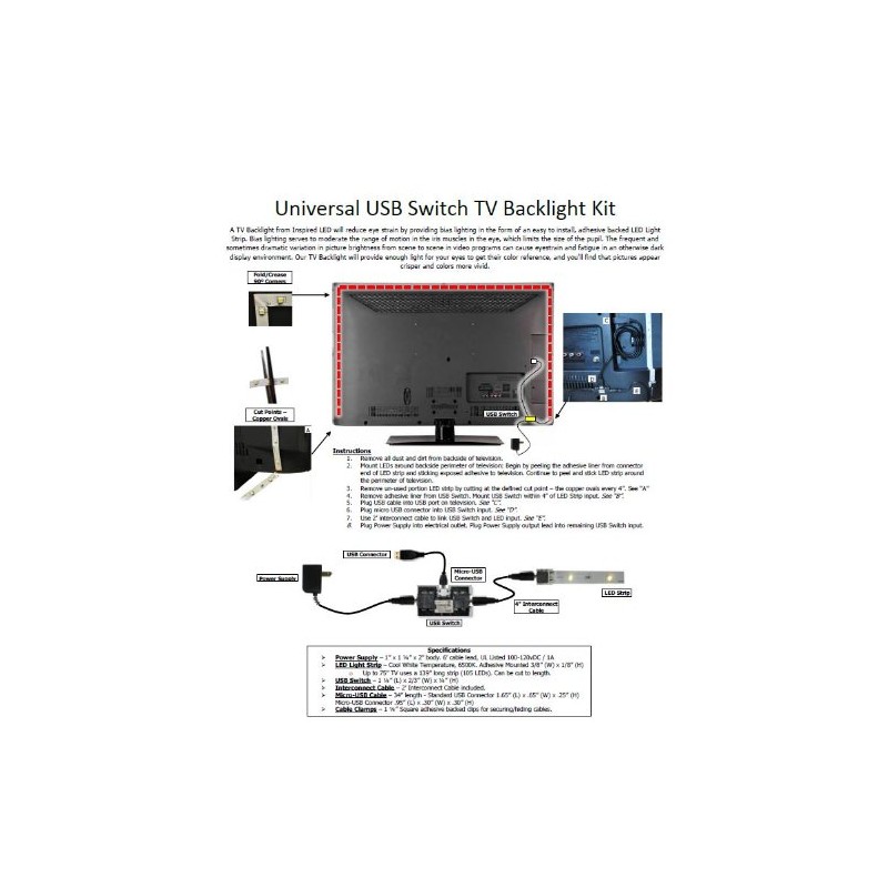 Inspired LED Universal TV Backlight Kit for up to 72" TV, with USB Switch