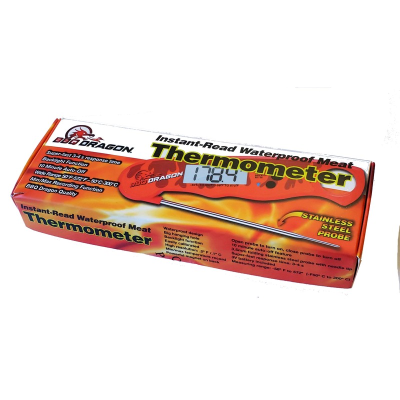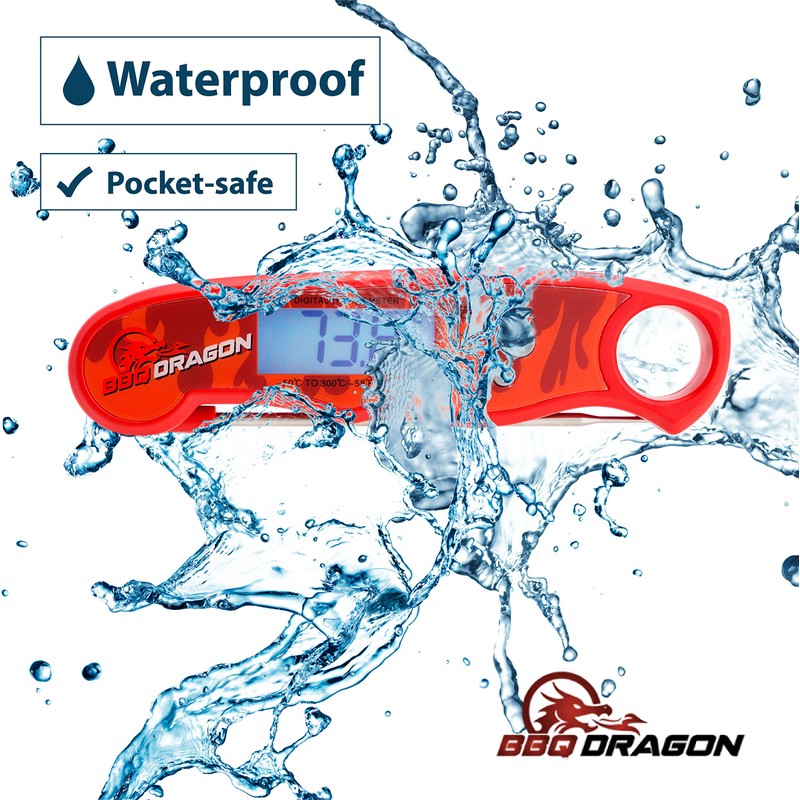 - NEEDLE-TIPPED BBQ THERMOMETER PROBE: The stainless steel probe is needle-tipped so it can puncture the surface of most meats. The long barbeque thermometer probe also makes it possible to reach the center of thick cuts of meat. The waterproof BBQ Dragon instant-read thermometer is easily cleaned by just running it under the kitchen sink.