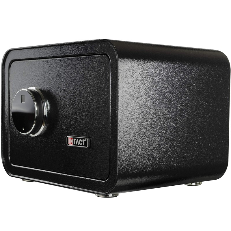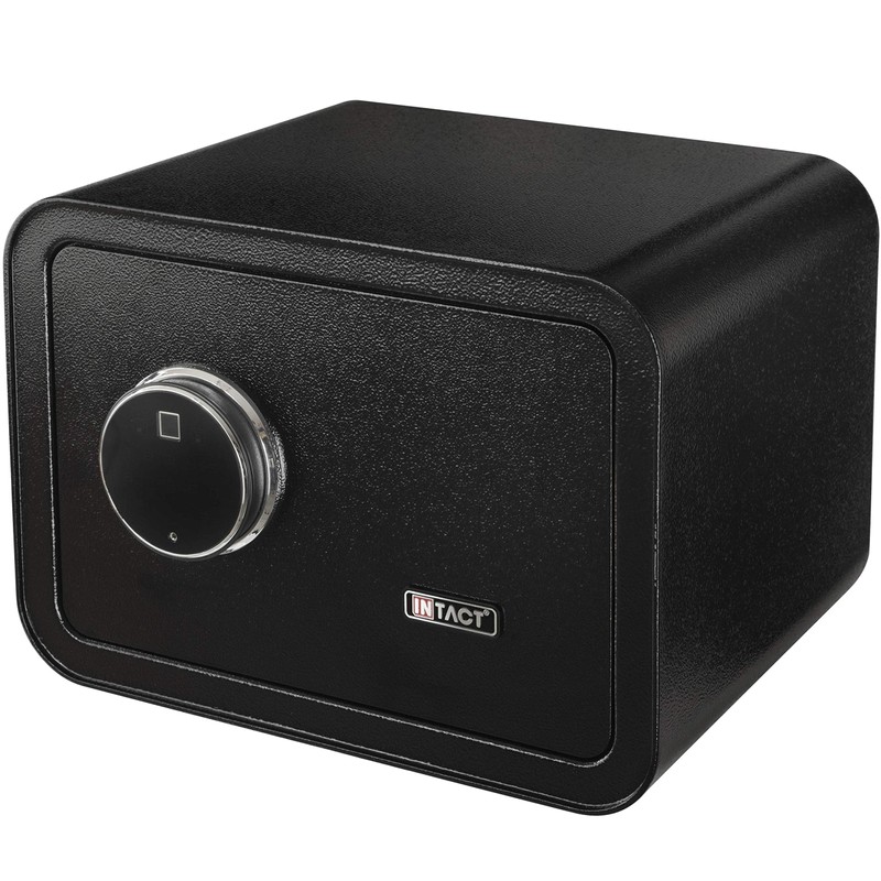The Intact quick access fingerprint compact safe features an industry leading biometric touch activated keypad module. Quickly and conveniently access the safe with your finger or passcode, no keys needed. The next-gen capacitive biometric sensor is quicker and more accurate than older optical scanning sensors. This innovative technology uses a solid capacitive sensor to instantly read and encrypt a user's fingerprint with a proprietary biometric algorithm. This safe is built solid and strong with an all steel construction of 1.5mm body and 3mm door thickness. This wide personal vault style design is perfect for storing valuables such as medicine, tablets, cameras, jewelry and handguns. This safe includes a mounting hardware that allows users to bolt the safe to a wall or cabinet. The biometric sensor is powered by 4 AA batteries (included) which can last up to 2 years with regular use. The safe also includes a backup power pack that can power the safe externally. For a third traditional access option each safe includes a set of laser cut keys that can be inserted in a hidden lock access point under the magnetized name plate. Once the safe is unlocked a turn of the safe’s round module will retract the solid steel deadbolts allowing the door to be opened. This safe also includes unique features such as a silent access mode,one removable shelf. This safe is not water or fire proof rated. All Intact safes included a limited lifetime warranty.