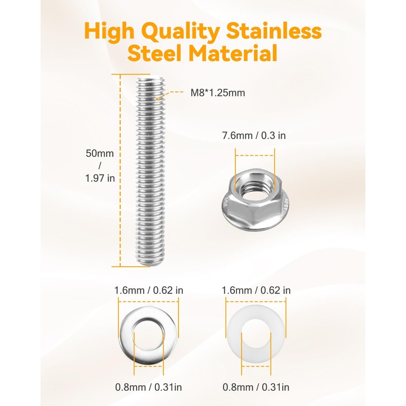 - Installation: The kit contains 20 sets of bolts, nuts, plastic washers and 304 stainless steel washers. Two washers of different materials are provided to meet different needs and easily complete maintenance and installation