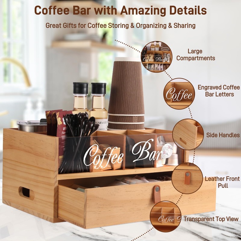 - 【Functional, Stylish, High-Quality Solid Wood Coffee Storage Box】Our wooden coffee storage box is a stylish and practical addition to any setting—whether at home, in the office, on a hotel welcome table, in a coffee shop, break room, or meeting area. It keeps all your coffee essentials—snacks, beverages, creamers, sugar, and biscuits—neatly organized in one place. No more searching around—everything is within easy reach, and everyone knows exactly where to find their favorite coffee-time items.