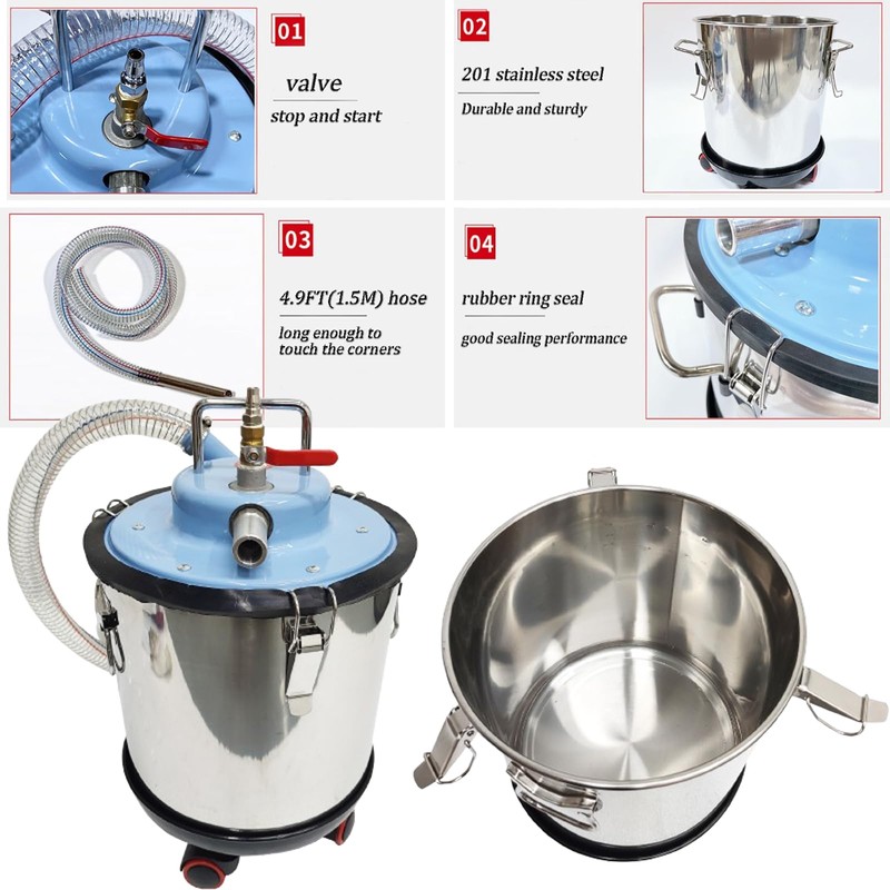 - Powerful Suction: Wet dry industrial vacuum extractor cleaner is powered by compressed air and can recover impurities in liquids, chip liquids, and waste liquids with a viscosity of up to 3000CP. And the float can stop working when the bucket is full to prevent overflow. The pneumatic interface is well crafted and has good air tightness