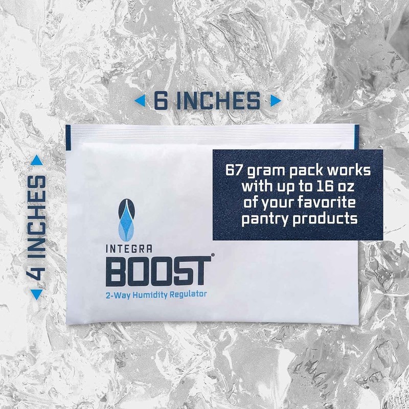 - PURE WATER VAPOR: Because our products don't emit anything but pure water vapor, Integra Boost humidity control packs pair perfectly with all your pantry products like herbs, tea, pasta, bread, grain, pet food, coffee, seeds, nuts, rice, spices, and seasonings. Boost offers superior terpene protection for sensitive products.