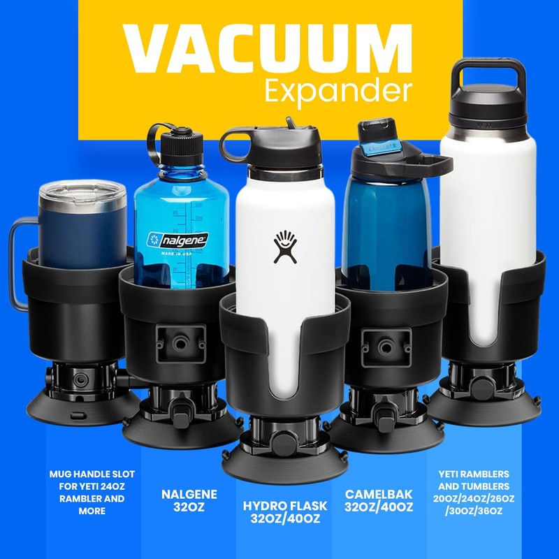 - EXPANDED CUP HOLDER - Fits most oversize bottles from 3.4" - 3.8" in diameter. Travel with your version of Hydro Flask, YETI, RTIC, Nalgene, CamelBak, and more. Note: Does not fit 14oz/46oz YETI Ramblers, 36oz RTIC Rambler, or any other 4" diameter bottle or mug.
