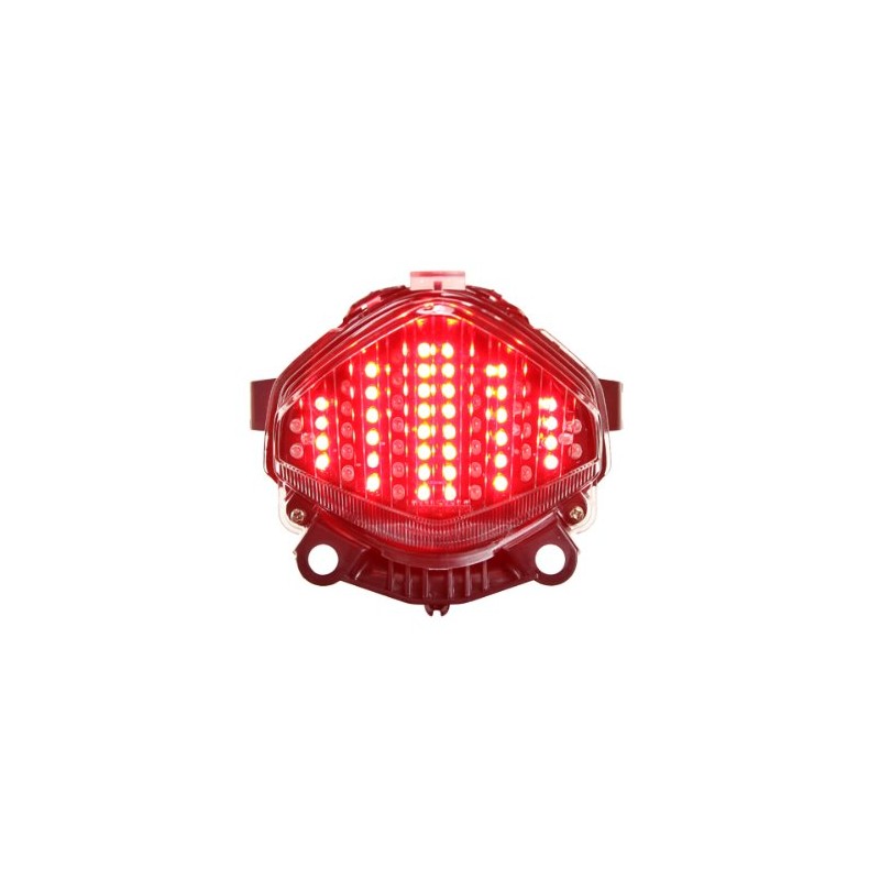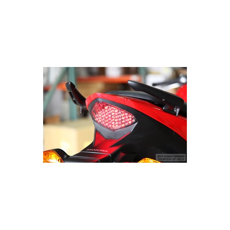 Features: \- **36** ultra bright red LEDs for running/brake light and **28** ultra bright yellow LEDs for turn signals -Programmable features: -ON/OFF Stop Alert -ON/OFF Sequential Signals -Direct plug and play with included sub-harness (OEM connectors for 100% bolt-on with zero modifications) -Resistors built into sub-harness -Stop Alert - utilizes 3 quick red flashes when brakes are applied initially -Sequential alternating yellow LED turn signals -Warranty: 1 year Fits: -2013-2015 Honda CBR500R/CB500X/CB500F Tail light is equipped with Stop Alert function, in which 3 quick flashes are applied when the brakes are pressed. Sequential LEDs flash in sequence in the direction you are turning or merging so there is no confusion which way you are going. A microprocessor is use with an integrated circuit chip (IC) to control all the functions of park, brake, and sequential signals. All IC chips are micro soldered by machine to deliver consistent and reliable solder points. Watch the video of it in action here: http://www.youtube.com/watch?v=CUR-KuICsdc