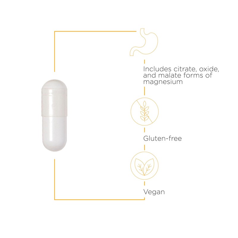 - Formula includes citrate, oxide, and malate forms of magnesium.