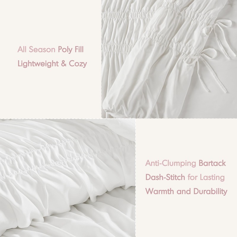 Intelligent Design Queen Comforter Set Ruched Shabby Chic Comforters for Queen Size Bed, All Season Lightweight Comforter Queen French Country Bedding Set, Shams, Ella, Full/Queen, White, 3 Piece