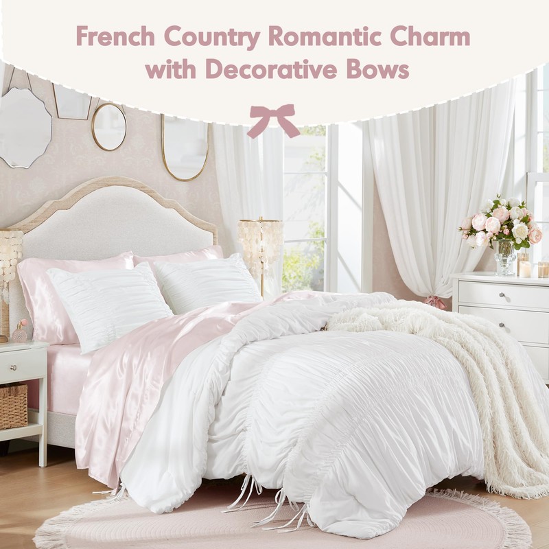 - French Country Comforter - Turn your bedroom into a romantic French country retreat with this enchanting comforter set. The cozy ruched design, adorned with pretty bow ties, adds a touch of shabby chic charm, creating a dreamy and cozy update