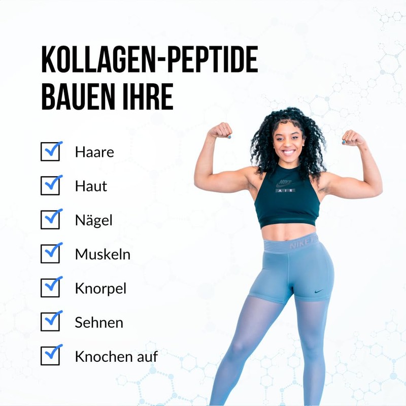 - ★ Wie Kollagen von Vorteil für Sie ist ★ Kollagen ist ein Protein, das zum Aufbau Ihrer Haut, Haare, Nägel, Muskeln und Knochen beiträgt. Wenn Sie 30 Jahre alt sind, produziert Ihr Körper weniger Kollagen. Dies kann zu Falten, schwächerer Haut, stumpfem Haar und brüchigen Nägeln führen. Kollagen ist außerdem wichtig für Ihre Muskeln und Gelenke, so dass eine geringere Kollagenproduktion Bewegung und Sport erschweren kann.