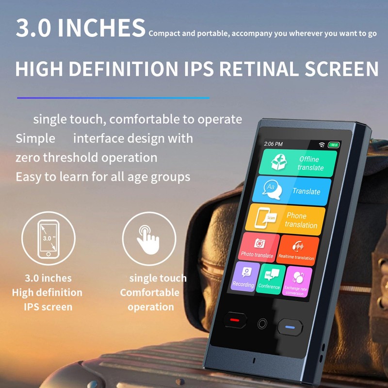 - 3.0 inch colour touch screen, easy to use: easy to use without the need to install an app on your phone. Simply connect the device to WiFi to start the translation. With a large capacity (1500 mAh) battery, it can standby for more than 7 days and work continuously for more than 8 hours. This portable translator is compact and lightweight, and can be easily carried in bags and backpacks.