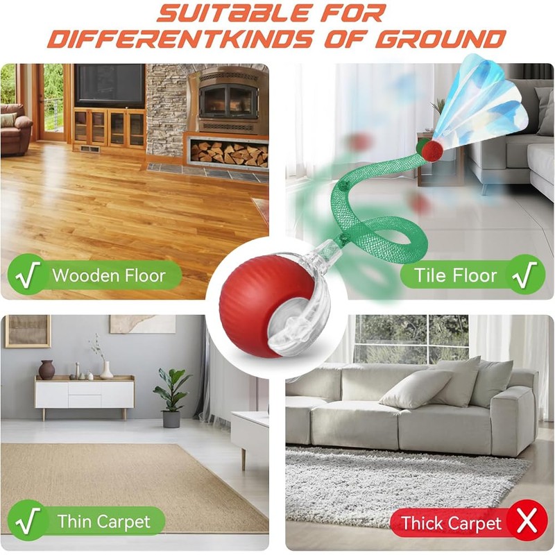 The cat toys powerful motor enables the interactive cat ball toy to move quickly on thick carpets, thin carpets, and hard floors. However, the movement speed on carpets is slightly slower than that on hard floors. If you notice a significant slowdown in running speed compared to before, follow the instructions to clean the hair on the connecting rod! This interactive cat toy an articulated elastic tail accessory creates lifelike rodent movements when combined with the ball's sequin tail, triggering cats' natural hunting instincts for extended play variety
