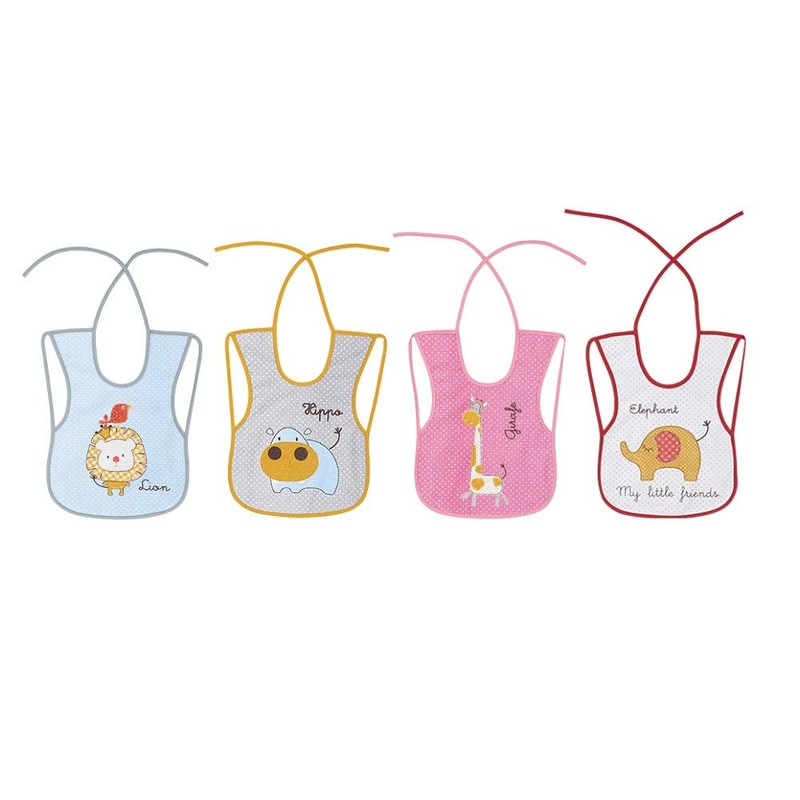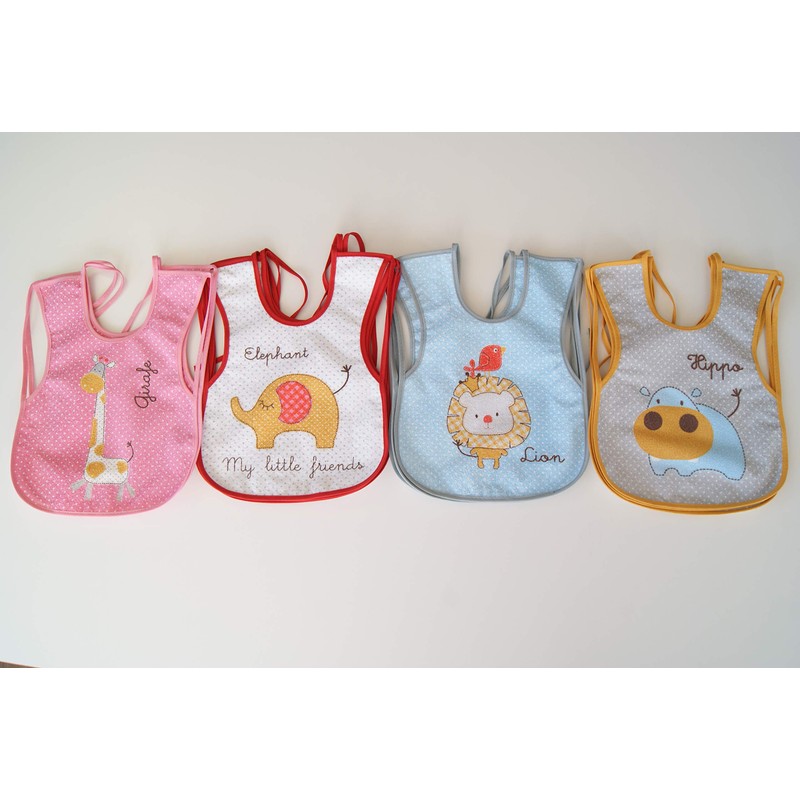 - Pack of 12 waterproof bibs with rectangular shape. Assorted colours and patterns.