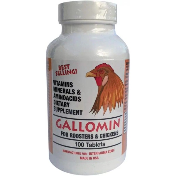 Description What is Gallomin? Gallomin is a multi-vitamin, mineral and amino acid supplements containing crude liver. Extra strength formula for roosters, growing chicks, studs and breeding chickens for good stock. Who is Gallomin for? Roosters, growing chicks, studs and breeding chickens. How is Gallomin used? Gallomin is applied directly to the beak as an amino acid supplement before eating: Young Chickens: 1 tablet every 3 days Adult Roosters: 1 tablet per day, 2 tablets daily for 5 days before an event. How much Gallomin will I receive? Each bottle contains 100 tablets. Formula: Per Tablet: Liver10 mg L- Lysine50 mcg D-Bitoine30 mcg Vitamin A300 USP Units Riboflavin35 mcg Vitamin D30 mcg Vitamin B630mcg Vitamin B130 mcg Vitamin B122.5 mcg Calcium Pantothenate30 mcg Niacinamide300 mcg Vitamin C2 mg Vitamin E0.12 IU Vitamin K60 mcg Calcium45 mg Zinc0.50 mg Phosphorus15 mg Cobalt0.3 mg Methidine2 mg Iron0.600 mg Magnesium0.28 mg Iodine16.2 mcg Manganese1.5 mg