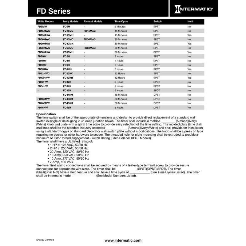 These energy saving timers use no electricity to operate. These timers are designed to replace any standard wall switch, single or multi-gang, and automatically limit the "ON" time of fans, lights, motors, heaters and other energy consuming loads. The "hold feature" allows the user to override the automatic shut-off function for extended use of the load as required. Supplied with a molded white time dial plate designed to fit either toggle or decorator style switch plates; single or multi-gang with no field modifications required to fit either style switch plate. Time saving "up front" terminal connection with teeter type terminals and an easy "press-on" knob design ensure quick and easy installation.
