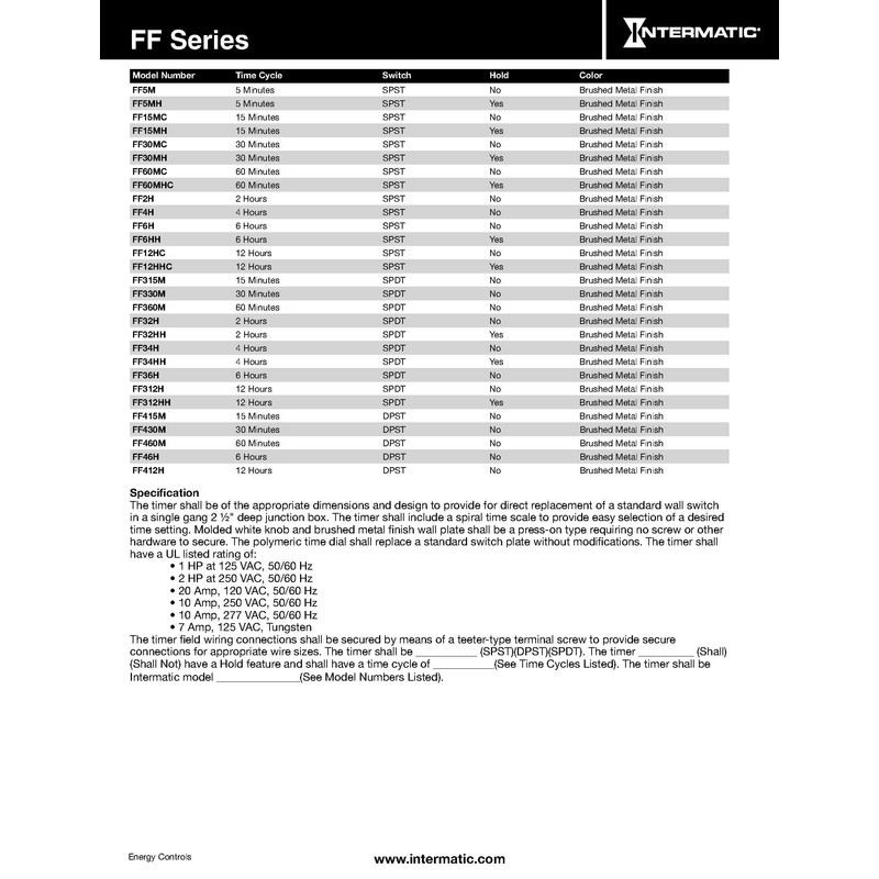 These energy saving timers use no electricity to operate. These timers are designed to replace any standard wall switch, single or multi-gang, and automatically limit the "ON" time of fans, lights, motors, heaters and other energy consuming loads. Supplied with a molded white time dial plate designed to fit either toggle or decorator style switch plates; single or multi-gang with no field modifications required to fit either style switch plate. Time saving "up front" terminal connection with teeter type terminals and an easy "press-on" knob design ensure quick and easy installation.