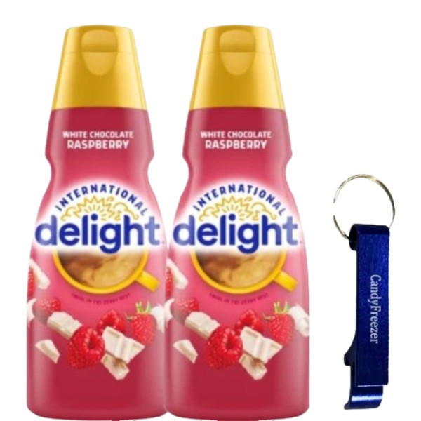 International-Delight Liquid Coffee Creamer.- Two (2) 32 fl oz Bottles of Smooth & Creamy Delightful Coffee Creamer and Candy Freezer Bottle Opener Keychain (White Chocolate Raspberry) - Keychain