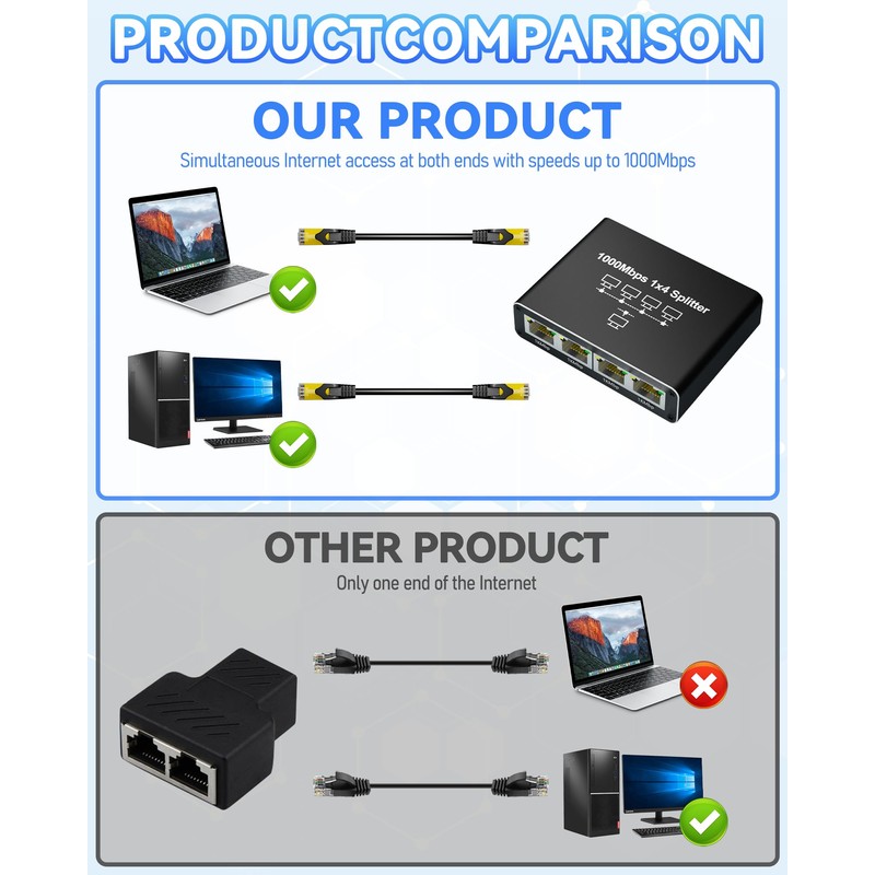 Ethernet Splitter 1 to 4 compatible with Cat5, Cat5e, Cat6, Cat7, and Cat8 cables, this compact splitter ensures reliable data transmission for all your networking needs.