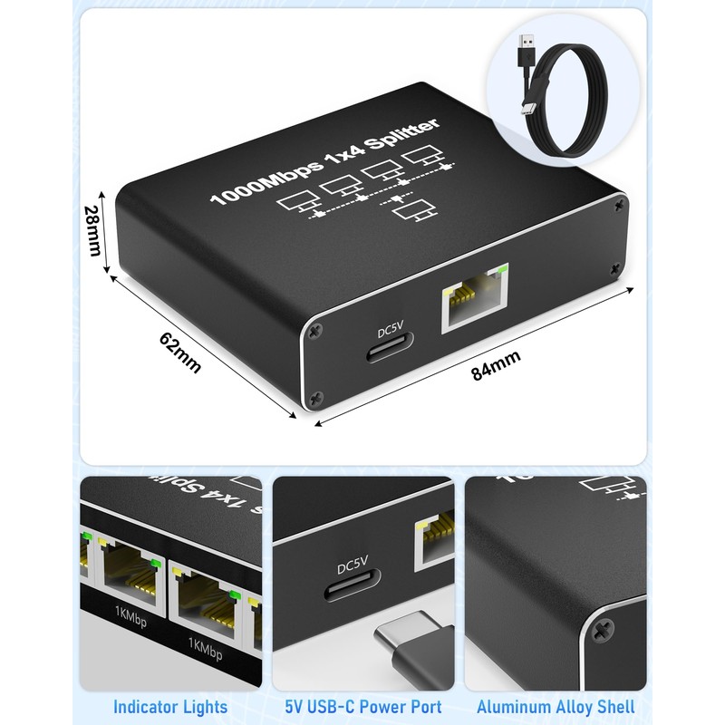 - POWER SUPPLY: Internet splitter 1 in 4 out Includes USB-C power cable for reliable and stable operation without the need for external power adapters